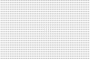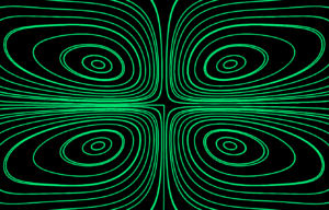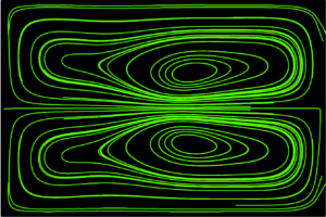 Alignment of elongated molecules with a slightly changed alignment int he middle and numerically calculated resulting flow, where highly oscillating electromagnetic field is induced via boundary control.
