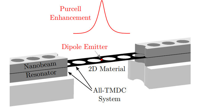 Fig. 1. Purcell enhancement in an all-TMDC nanobeam resonator. The 2D material, which is a TMDC monolayer, acts as an active layer. The emission process can be modeled by a dipole emitter that couples with the resonance modes of the system.