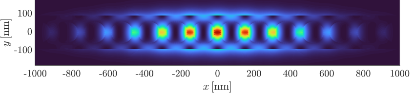 Fig. 1. Electric field intensity of the dominant resonance mode of an all-TMDC nanobeam resonator. The system is optimized such that the maximum intensity is located at the center of the resonator, which is the location of the considered dipole emitter.